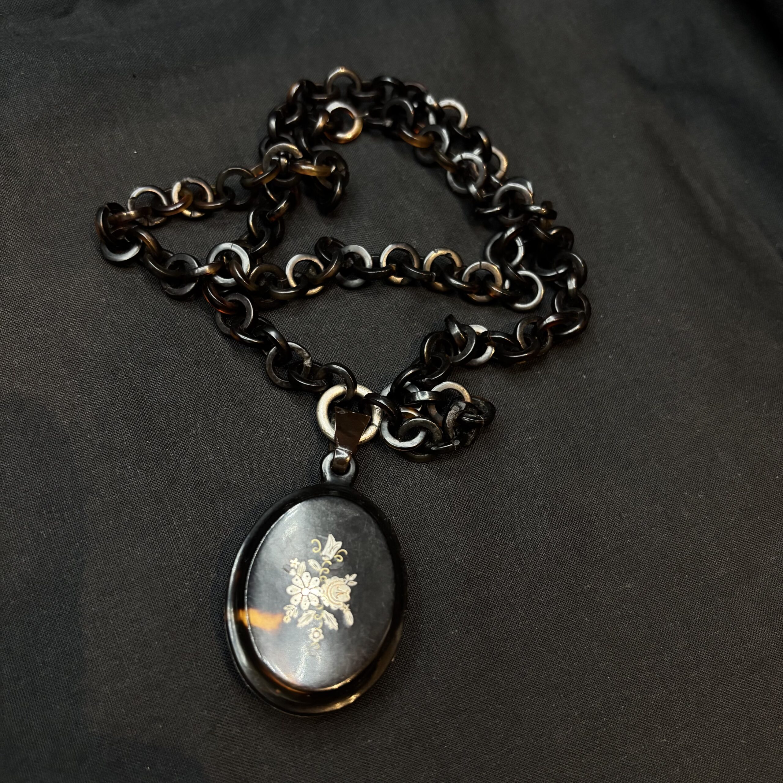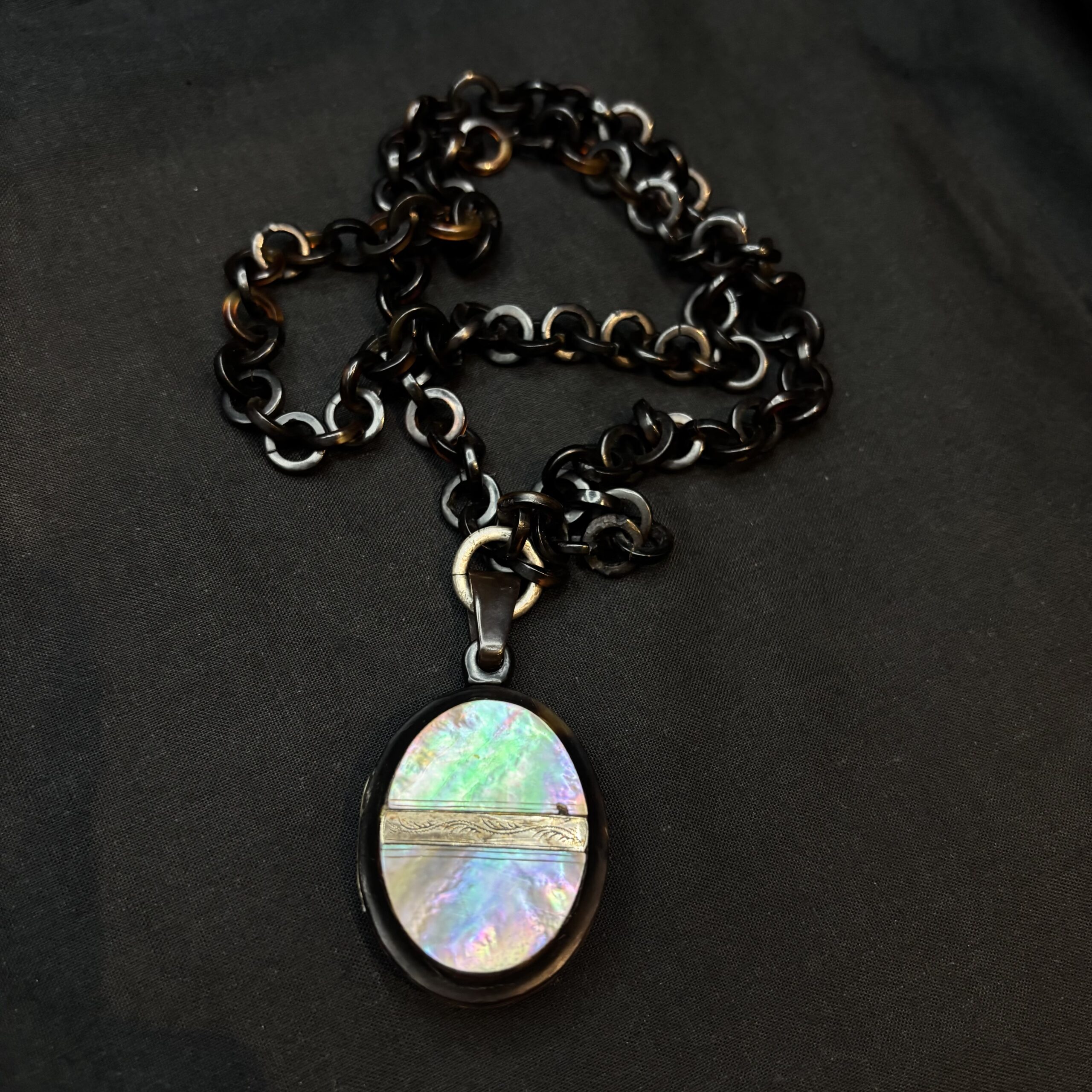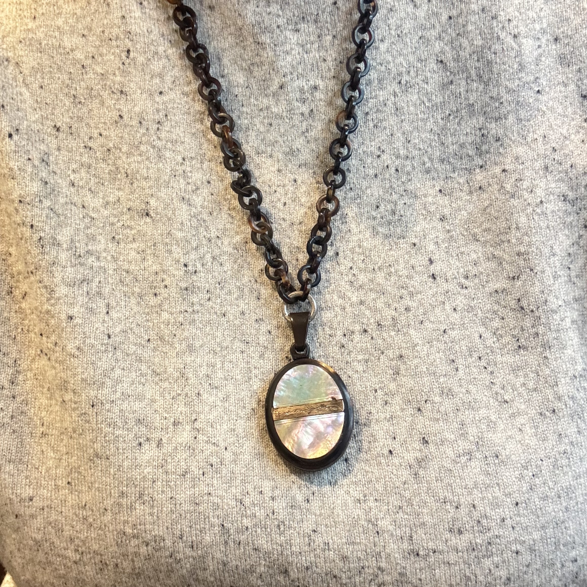 Jolie chaine avec porte photos en écailles et nacre avec incrustations de filets d’argent et d’or