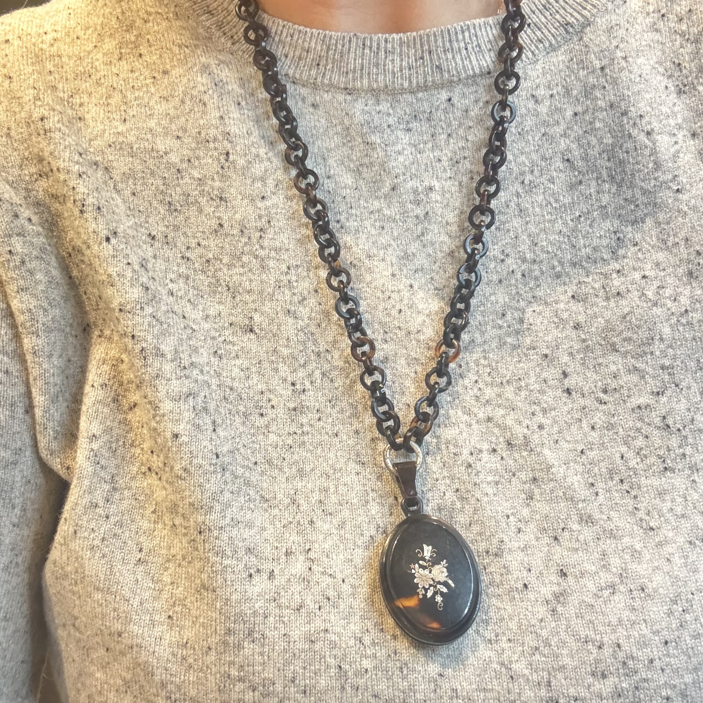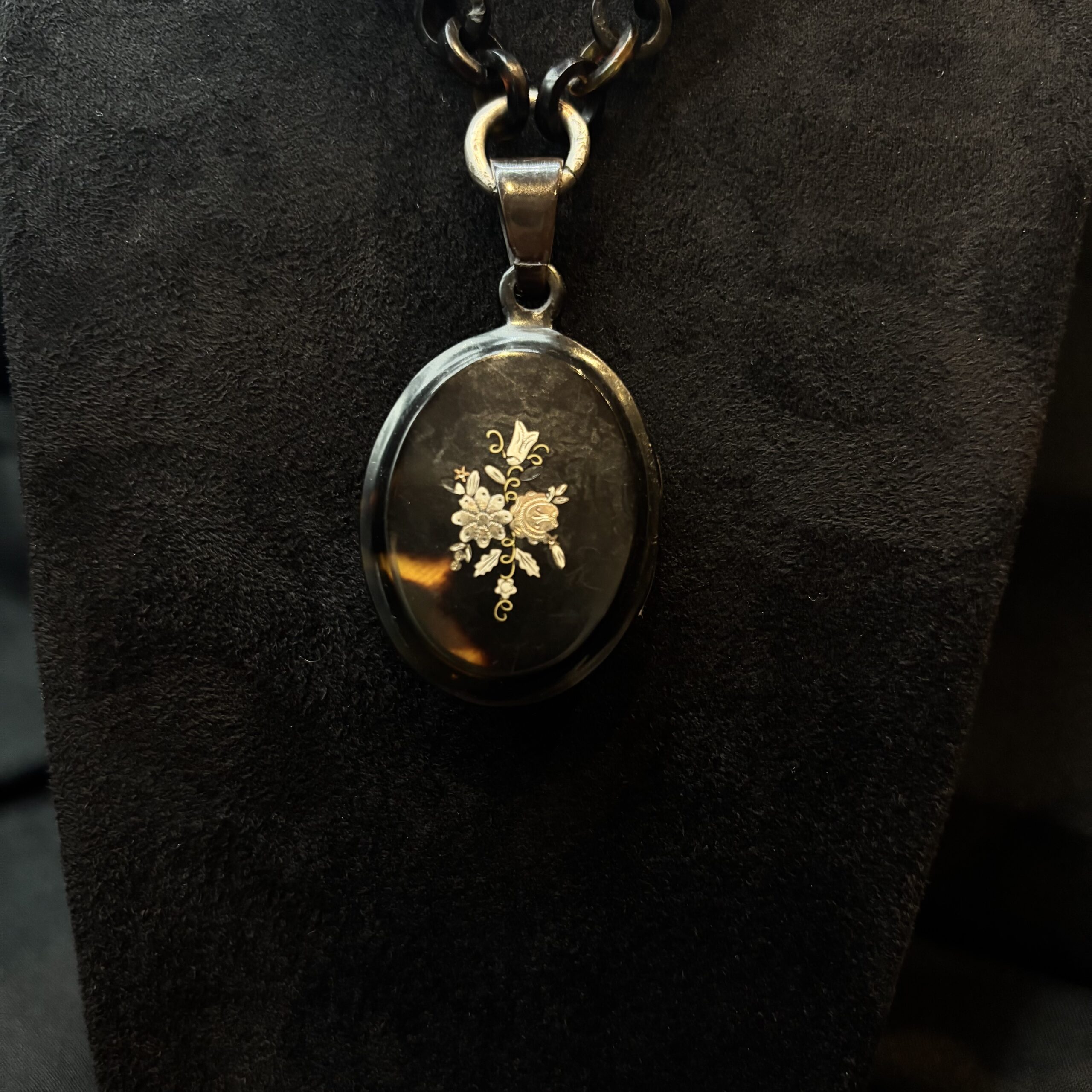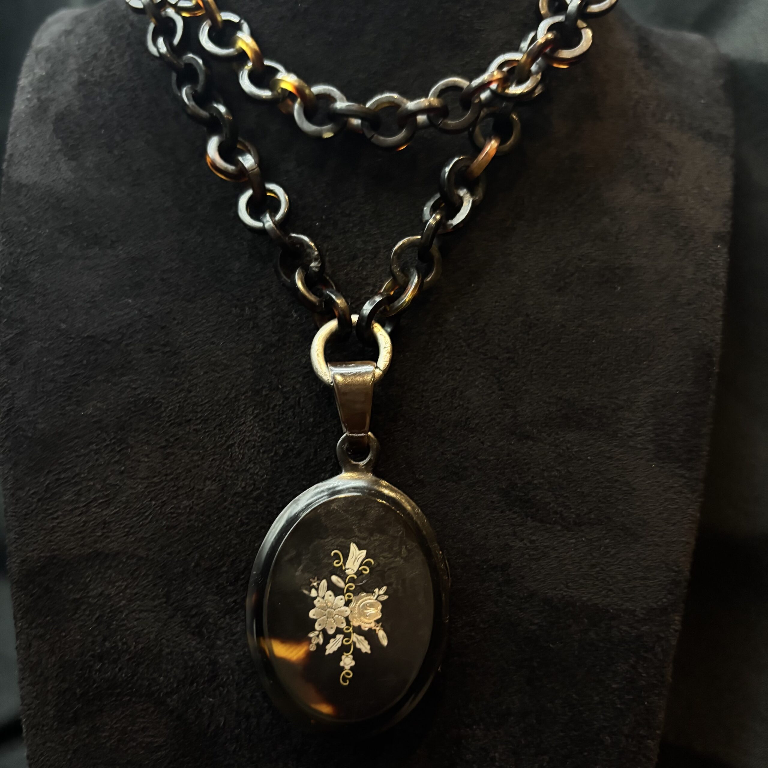 Jolie chaine avec porte photos en écailles et nacre avec incrustations de filets d’argent et d’or